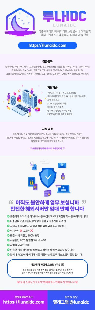 ✅루나IDC LUNAIDC - 각종 해외서버 해외디도스전용서버 디도스방어 해외원격 헤외가상데스크탑 해외VPS 해외VPN 판매 도메인 VPN SSL 등 모두 판매✅